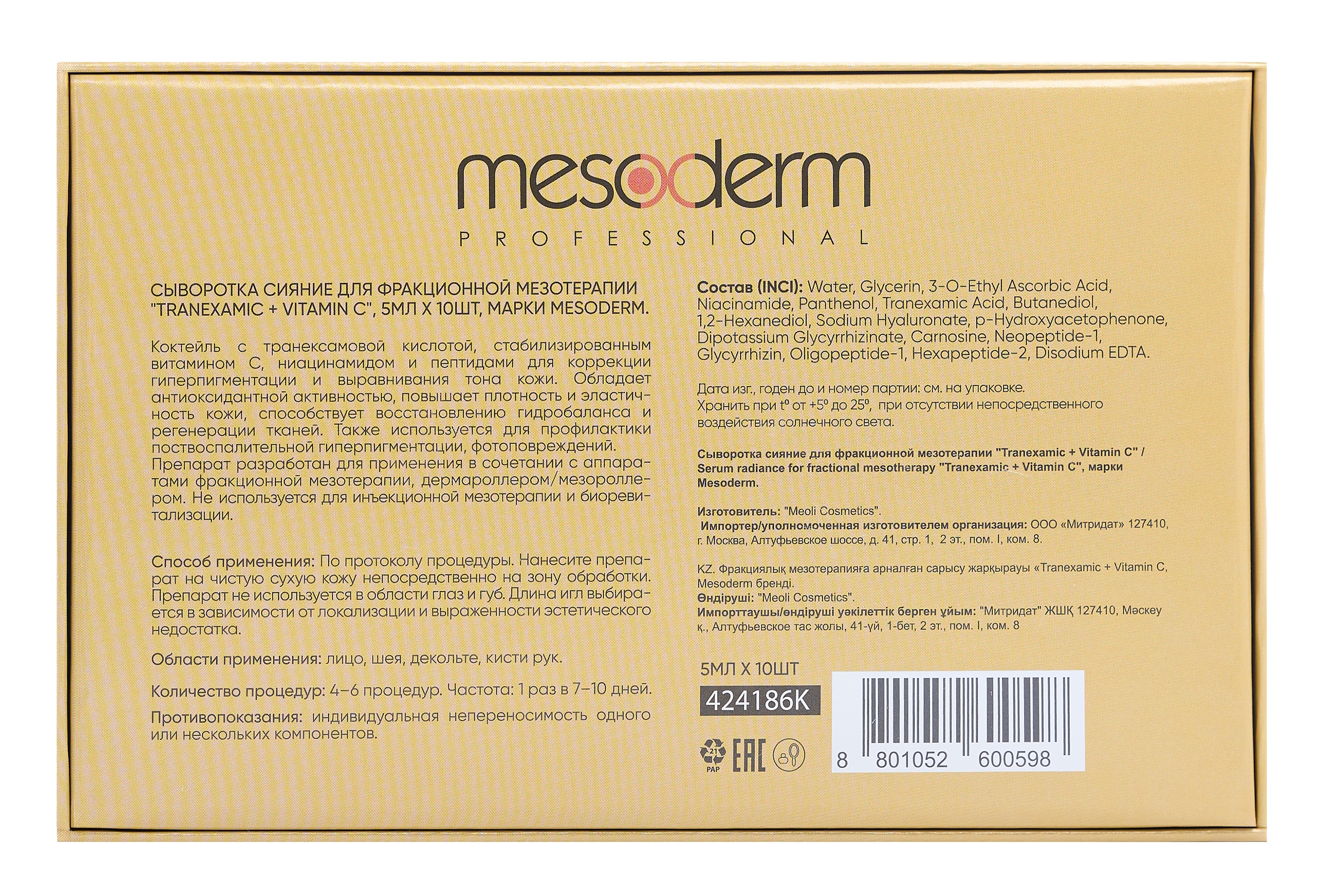 Сыворотка предназначена для процедур фракционной мезотерапии, микронидлинга, под мезороллер и дермапен. Формула средства комбинирует мощные осветляющие, восстанавливающие и омолаживающие компоненты: транексамовую кислоту, стабилизированный витамин C, ниацинамид и пептиды. Осветляет яркость пигментных пятен, осветляет кожу, выравнивает тон, оказывает эффект лифтинга. Препарат помогает повысить плотность, эластичность и упругость кожи.